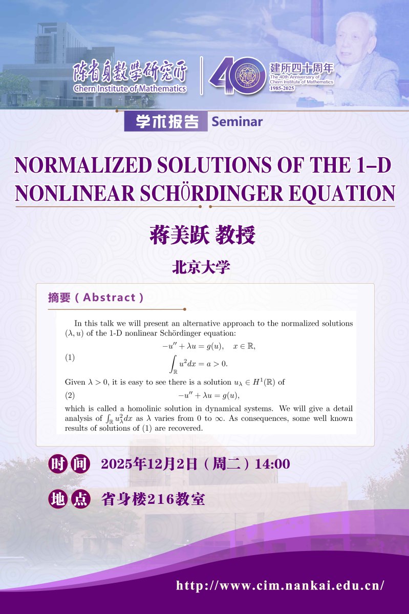 Chern Institute of Mathematics, Nankai University, Tianjin,China. 300071 Tel: 86-22-2350-8228、86-22-2350-1029, Fax: 86-22-2350-8114, Email:cim@nankai.edu.cn