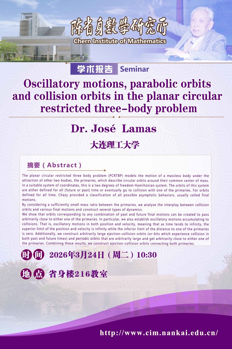 Dr. José Lamas:Oscillatory motions, parabolic orbits and collision orbits in the planar circular restricted three-body problem